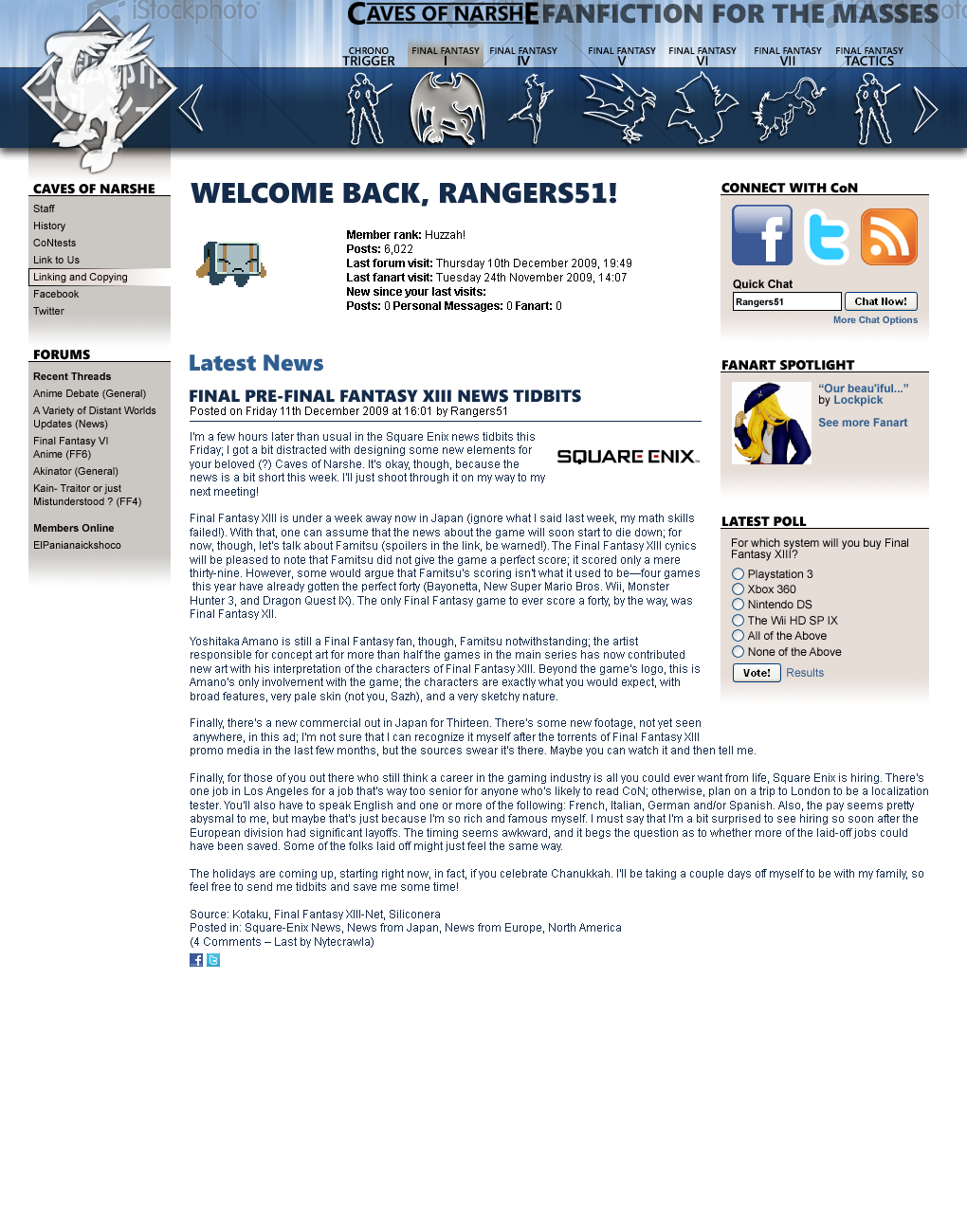 While the reboot for the Final Fantasy V section was still underway, R51 turned to creating the server underpinnings that made the new skin possible - without getting too boring with the technical details, the hurdle in the new skin was that the navigation templates that already existed on CoN simply wouldn't fit the style of navigation that either Skyline or Glissade needed. To make the navigation work, it needed to be separated from the presentation so that various skins could use it in different ways. The result was an all-new nav that is written in XML, with PHP-based parsers that can output any kind of HTML a skin might need to build its navigation. With this hurdle out of the way, six months of intense development led up almost to the very day of release, combining the navigation structure and header of Skyline with the visual flourishes of Glissade 2 into what we released on 31 July 2012 as "Skyglade."